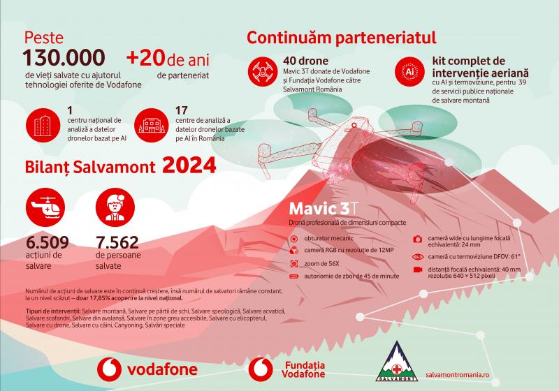 În ultimii 20 de ani, parteneriatul cu Vodafone și Fundația Vodafone a contribuit la peste 110.000 de intervenții și la salvarea a mai mult de 130.000 de vieți, într-un context în care numărul de apeluri crește constant, iar provocările devin tot mai complexe, de la drumeții la sporturi extreme. Cu un număr redus de salvatori activi zilnic pe munte, tehnologia devine forța multiplicatoare vitală: dronele de căutare, comunicațiile avansate și soluțiile digitale oferă echipelor șanse mai mari de a ajunge la timp acolo unde fiecare secundă contează.