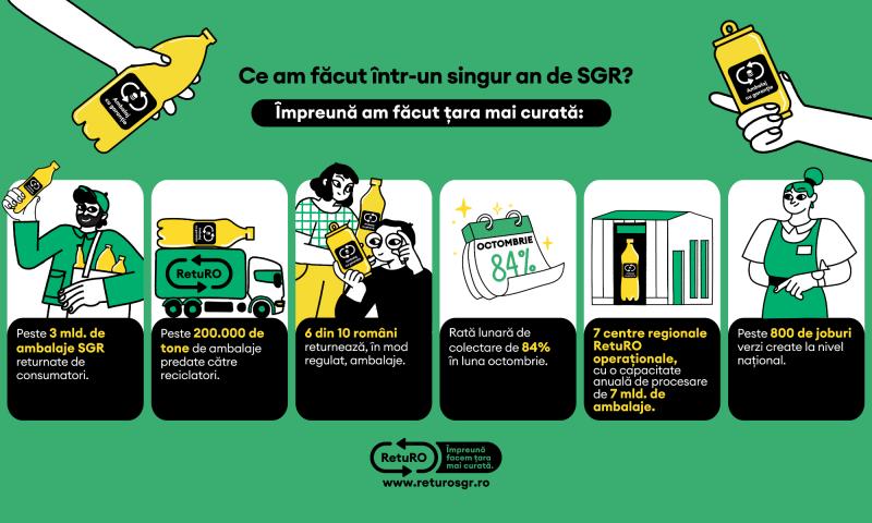 În primul an, românii au returnat peste 3 miliarde de ambalaje, rezultând 205.000 de tone de materiale - PET, sticlă și metal - care au fost deja predate reciclatorilor, contribuind la reintegrarea acestor resurse în piață și la reducerea impactului asupra mediului. Mai mult decât atât, sistemul a înregistrat un progres exponențial, cu o creștere susținută de la o lună la alta. În ultimele trei luni, rata lunară de colectare, a depășit, în medie, 80%.