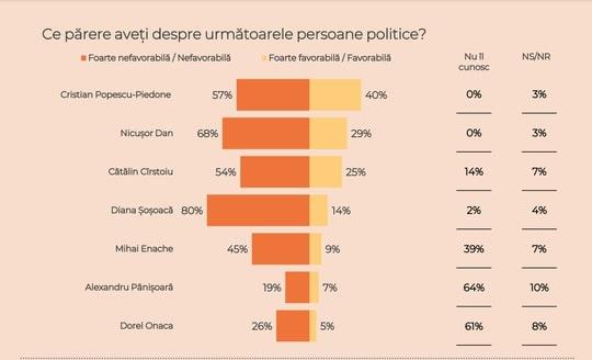 80% dintre cei chestionaţi au o părere nefavorabilă despre Diana Şoşoacă, 68% au o astfel de părere despre Nicuşor Dan, 57% au o părere nefavorabilă despre Cristian Popescu Piedone şi 54% au o părere nefavorabilă despre Cătălin Cîrstoiu.