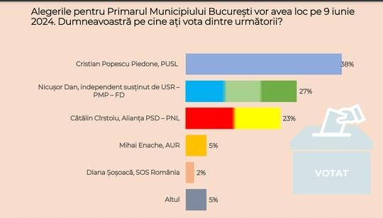 38% dintre cei chestionaţi ar vota pentru Cristian Popescu Piedone la Primăra Capitalei, 27%, pentru Nicuşor Dan, 23%, pentru Cătălin Cîrstoiu, 5% pentru candidatul AUR Mihai Enache şi 2% pentru Diana Şoşoacă.