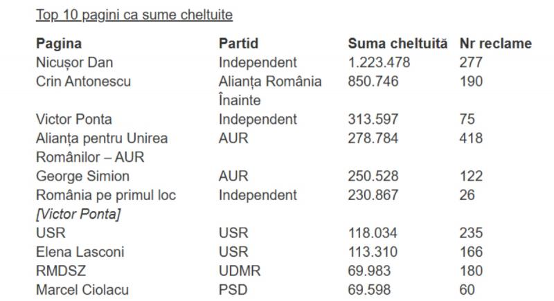Cei mai mulți bani au fost cheltuiți de Nicușor Dan – 1,2 milioane de lei, Crin Antonescu (Alianța România Înainte) – 853 mii de lei, AUR – 821 mii de lei și Victor Ponta – 544 mii de lei.