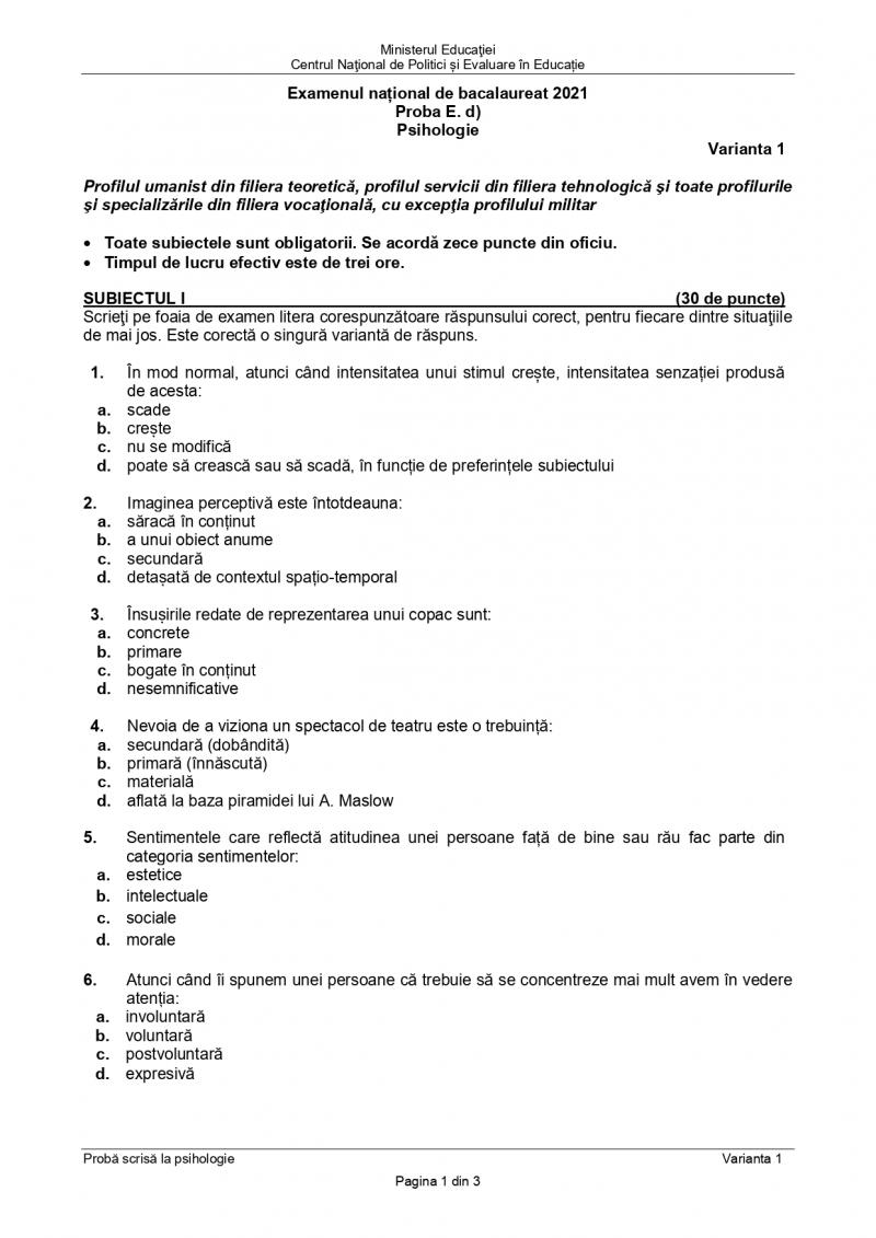 - Subiectele și baremul de corectare la Psihologie au fost publicate pe Observatornews.ro