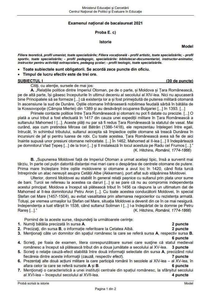 Subiecte istorie Bac 2021. Model şi barem de rezolvare