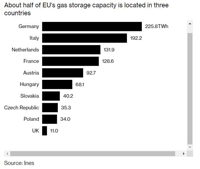 Germania este dependentă de alte state pentru că depozitele sale acoperă doar 25% din cererea anuală. Polonia este şi ea într-o situaţie precară. A cincea cea mai populată ţară din UE, cu 38 de milioane de locuitori, are capacităţi de stocare de gaze mai mici decât Slovacia, ţară cu o populaţie de 5,5 milioane de locuitori.