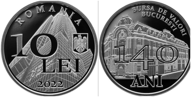 Potrivit băncii centrale, aversul monedei prezintă sediul actual al Bursei de Valori Bucureşti, inscripţia în arc de cerc "ROMANIA", valoarea nominală "10 LEI", stema României şi anul de emisiune "2022". Reversul monedei prezintă o imagine de epocă a sediului vechi al Bursei de Valori Bucureşti şi inscripţiile "BURSA DE VALORI BUCURESTI" şi "140 ANI".