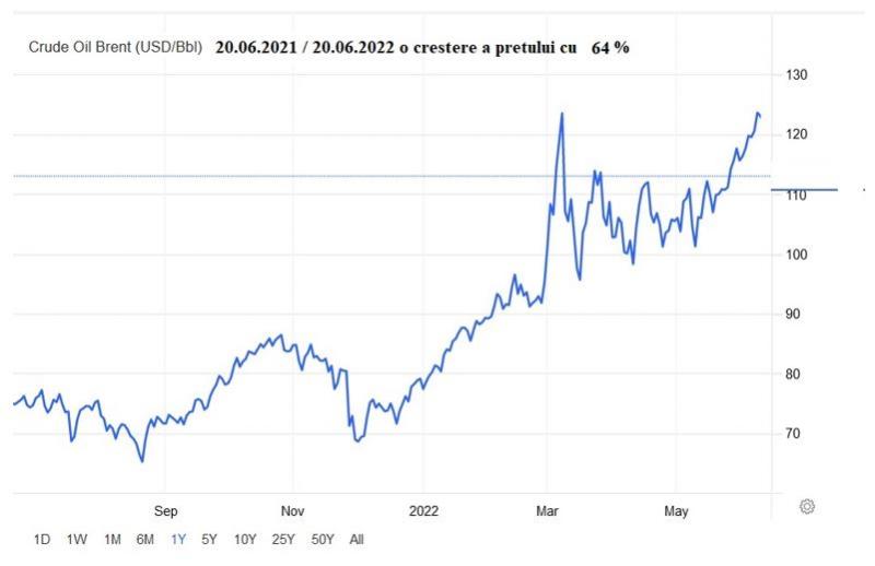 - Creșterea cotațiilor țițeiului cu 64%, față de cotațiile din aceeași zi a anului 2021