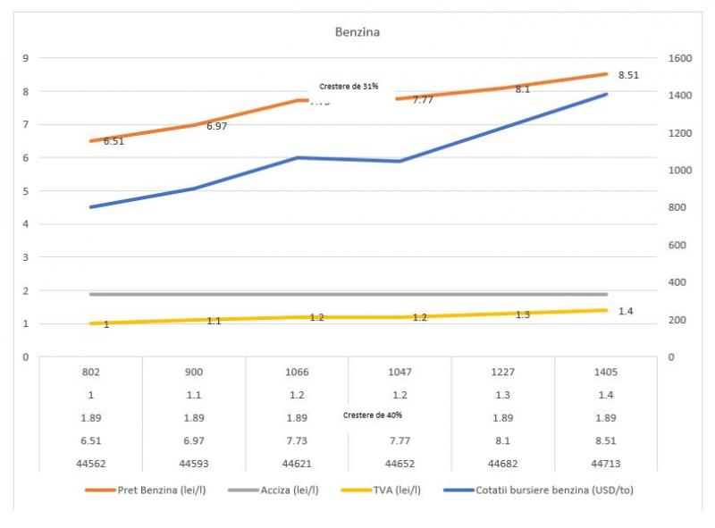 Urmărind cotațiile benzinei în anul 2022 putem să observăm că acestea au crescut cu 75%, mai mult decât dublu față de creșterea de preț din România. În același timp trebuie să observăm că statul a profitat din plin de pe urma acestei creșteri, banii încasați din TVA în acest an, din vânzarea benzinei crescând cu 40%.