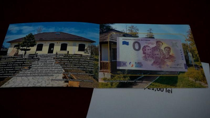 Bancnota suvenir, de zero euro, care ilustrează cele patru mari personalităţi ale României face parte din dintr-o colecţie de 12 bancnote, iar tirajul pentru acest model este de 11.000. Dacă o parte dintre acestea vor ajunge în judeţul Botoşani, restul va fi răspândit colecţionarilor din întreaga lume.