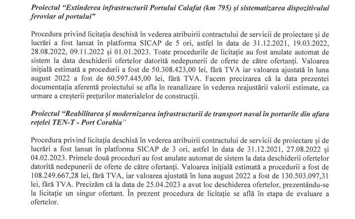 În 2021 Administraţia Portuară a Dunării Fluviale Giurgiu anunța că scoate la licitație contractele pentru modernizarea porturilor Calafat și Corabia pentru suma de 38 de milioane de euro. Licitațiile au rămas fără ofertă, iar statul a crescut bugetul la aproape 46 de milioane de euro. De 3 ori s-a ținut până acum licitația la Corabia și de 5 ori la Calafat, însă nici până acum soarta porturilor nu este clară.