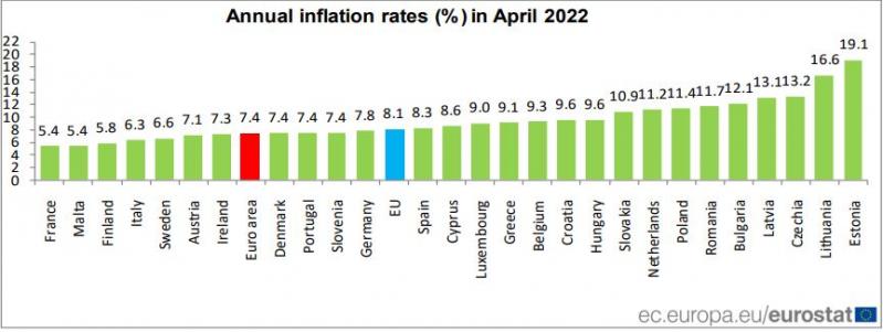 Comparativ cu situaţia din luna martie 2022, rata anuală a inflaţiei a crescut în 22 de state membre, inclusiv în România, de la 9,6% până la 11,7%. În luna aprilie 2021, rata anuală a inflaţiei în Uniunea Europeană a fost de 2% iar în România a fost de 2,7%.
