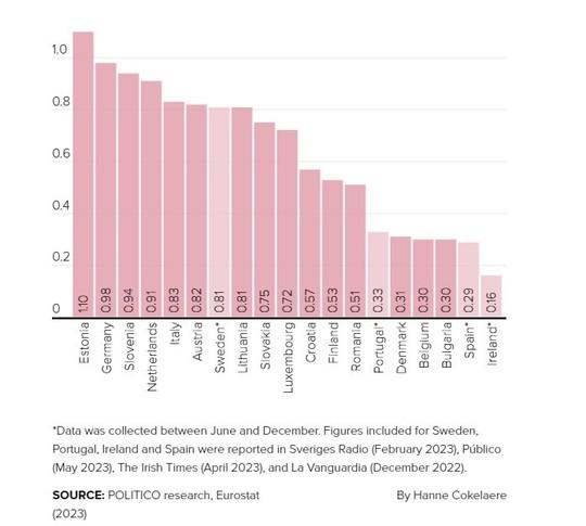 Calculele bazate pe datele disponibile arată că ţările UE au aruncat în medie 0,7 vaccinuri pentru fiecare membru al populaţiei lor. În fruntea clasamentului se află Estonia, care a aruncat la gunoi mai mult de o doză (1,10) pe cap de locuitor, urmată îndeaproape de Germania (0,98), care a aruncat şi cel mai mare volum brut de fiole. În acest clasament, România este sub media europeană, pe locul al 13-lea, cu 0,51 de doze de vaccin aruncate raportat la cap de locuitor, iar ultimul loc (din cele 19 posibile) este ocupat de Irlanda, cu 0,16 doze. Dacă această rată medie de risipă ar fi proiectată în restul UE, aceasta ar însemna peste 312 milioane de vaccinuri distruse, notează POLITICO.