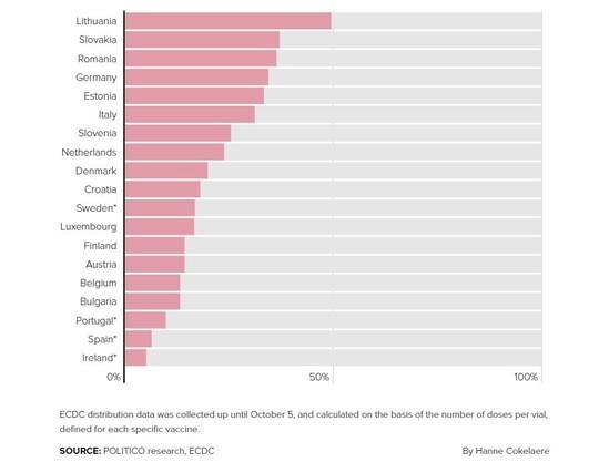 Într-un clasament întocmit de POLITICO (pe baza datelor de la ECDC disponibile până la 5 octombrie) cu numărul de vaccinuri pe care ţările le-au raportat ca fiind irosite, în comparaţie cu numărul de vaccinuri care le-au fost distribuite, România figurează pe locul al treilea, fiind devansată de Lituania şi Slovacia, în timp ce ultimul loc este ocupat de Irlanda.