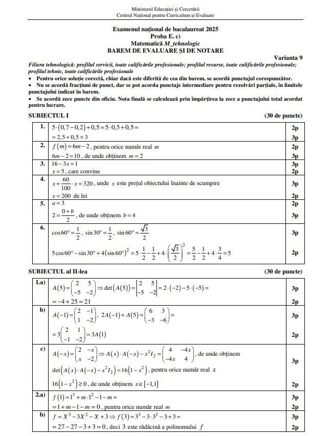 Bacalaureat 2025. Barem Matematică - Tehnologic