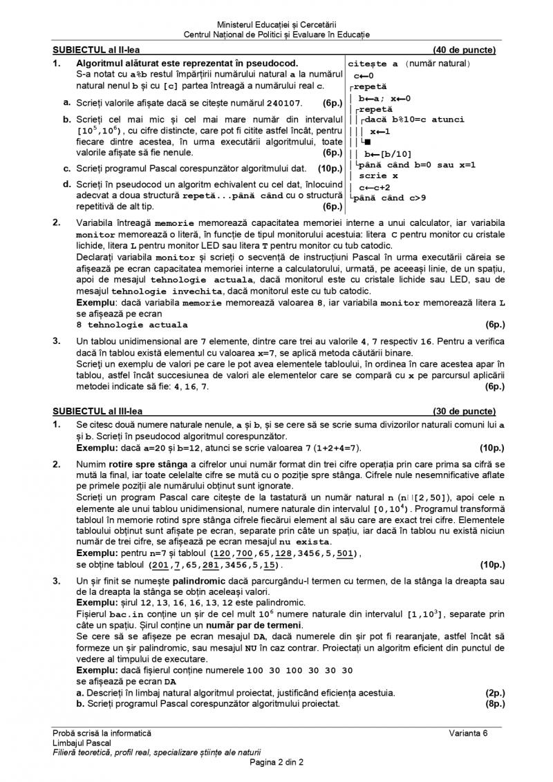 Subiecte Informatică - profil real, științele naturii - Limbajul Pascal