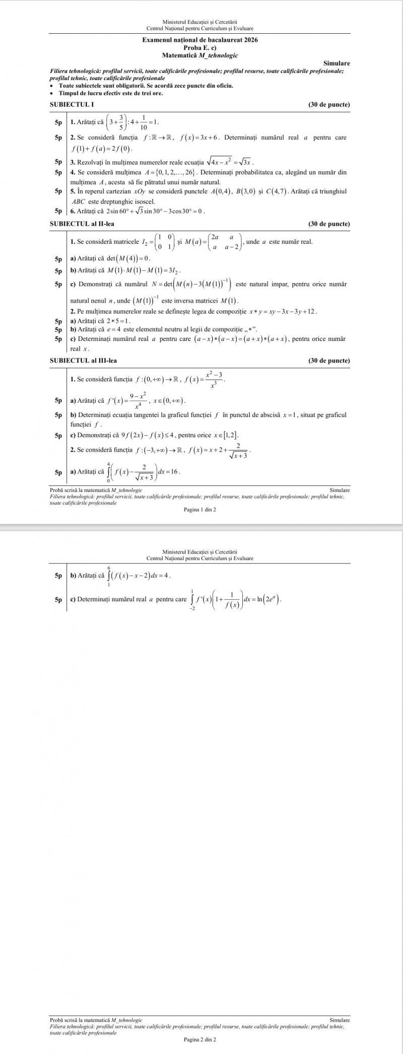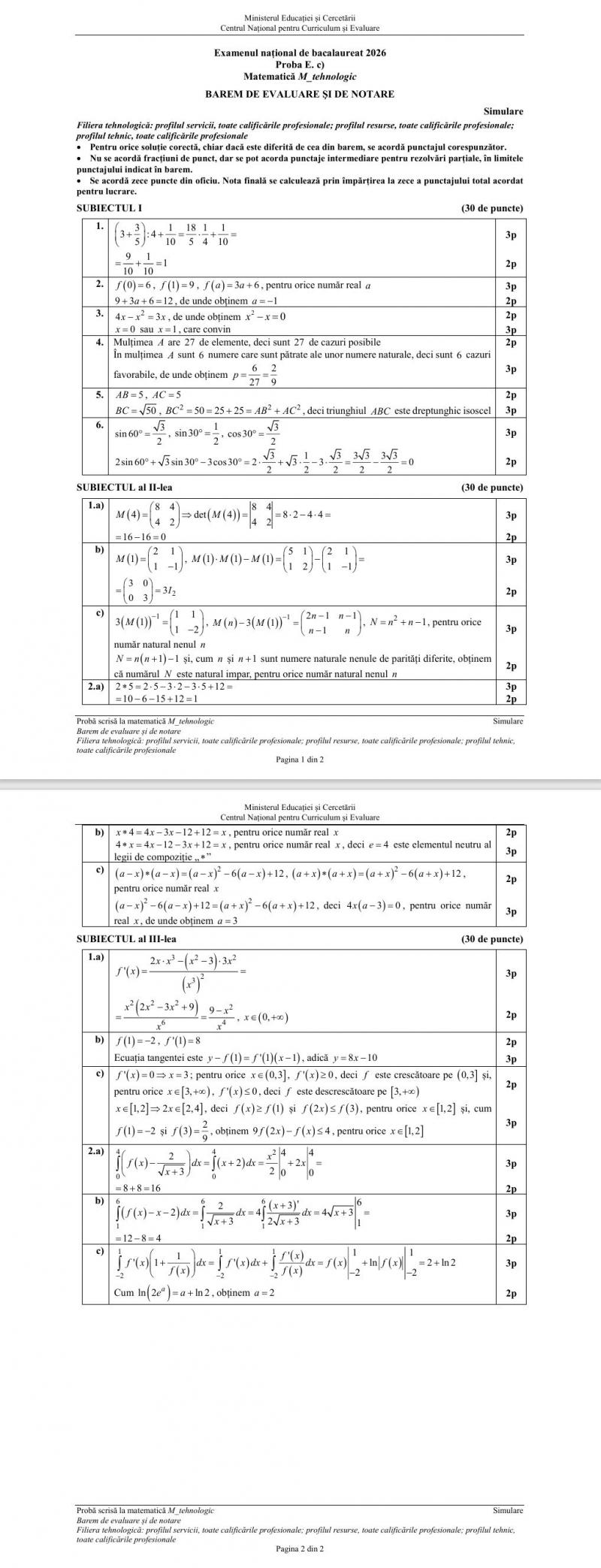 Marţi, 24 martie, elevii de la profil real, pedagogic, ştiinţele naturii şi tehnologic au avut de susţinut simularea examenului de Bacalaureat 2026 cu proba obligatorie a profilului, Matematică, după ce, luni, elevii au susținut proba scrisă la limba și literatura română. Baremul a fost postat pe siteul Ministerului Educaţiei la ora 15.00.