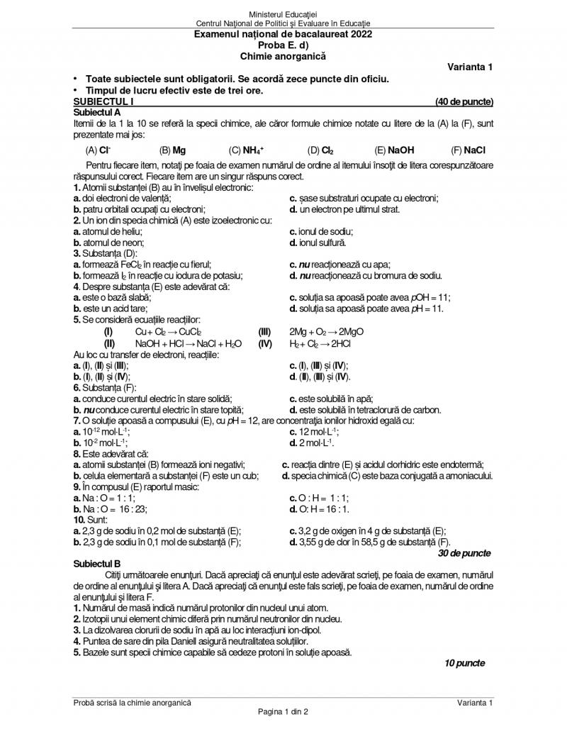 Ministerul Educației a publicat, pe subiecte.edu.ro, baremul de corectare și subiectele de la proba la alegere a profilului de la examenul de Bacalaureat 2022 - chimie anorganică.