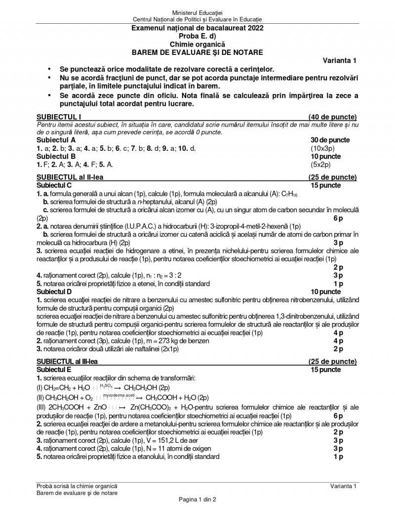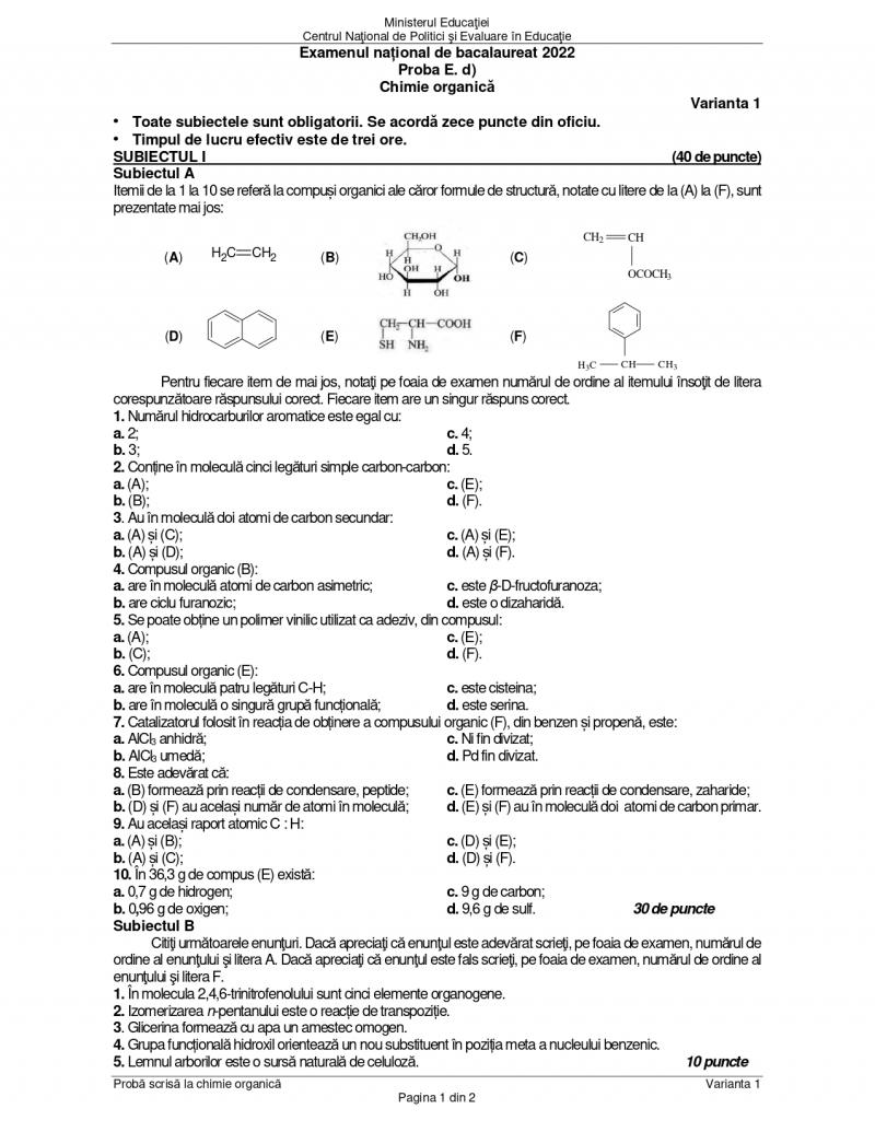 Ministerul Educației a publicat, pe subiecte.edu.ro, baremul de corectare și subiectele de la proba la alegere a profilului de la examenul de Bacalaureat 2022 - chimie organică.