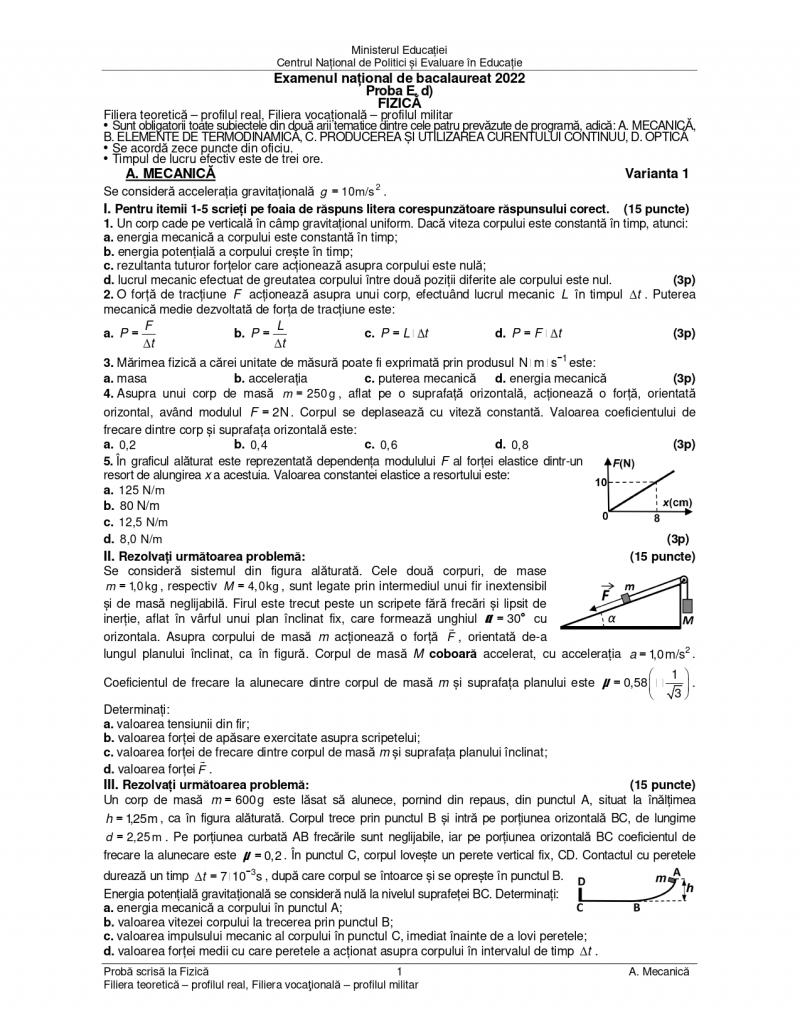 Subiecte fizică - filiera teoretic/vocaţional - BAC 2022