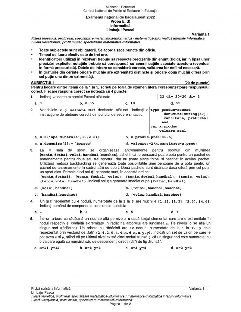 Ministerul Educației a publicat, pe subiecte.edu.ro, baremul de corectare și subiectele de la proba la alegere a profilului de la examenul de Bacalaureat 2022 - informatică.