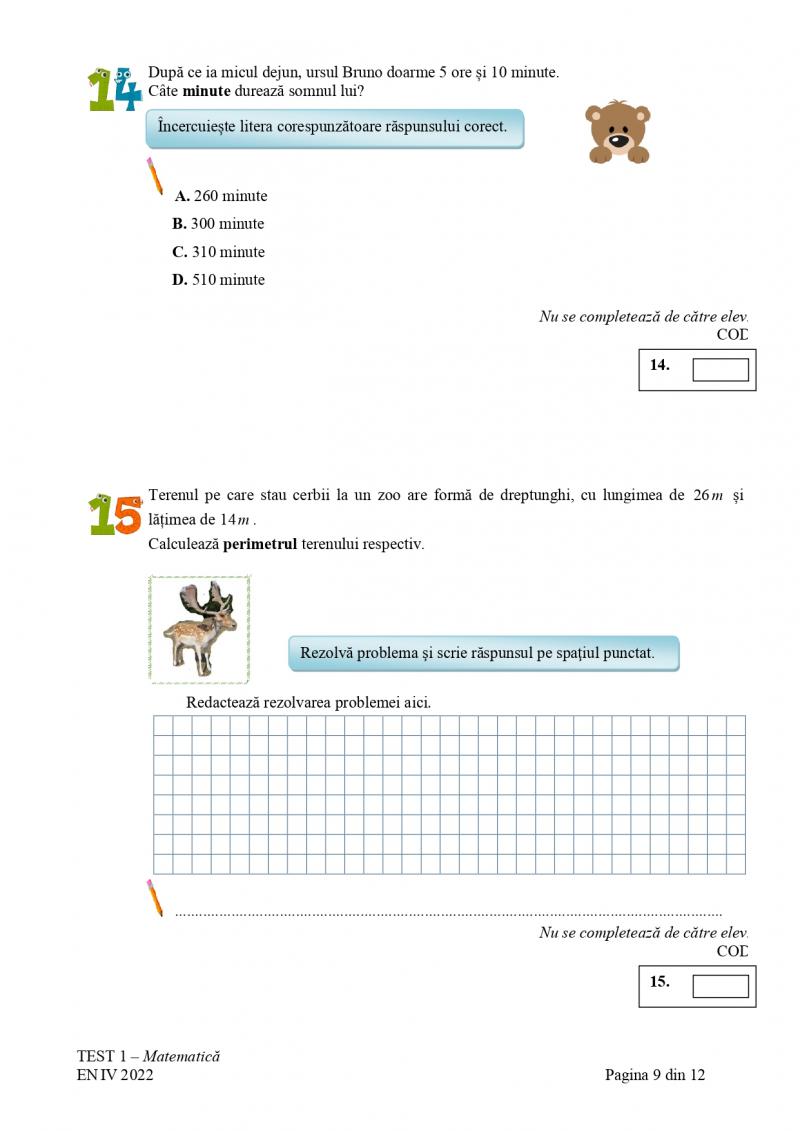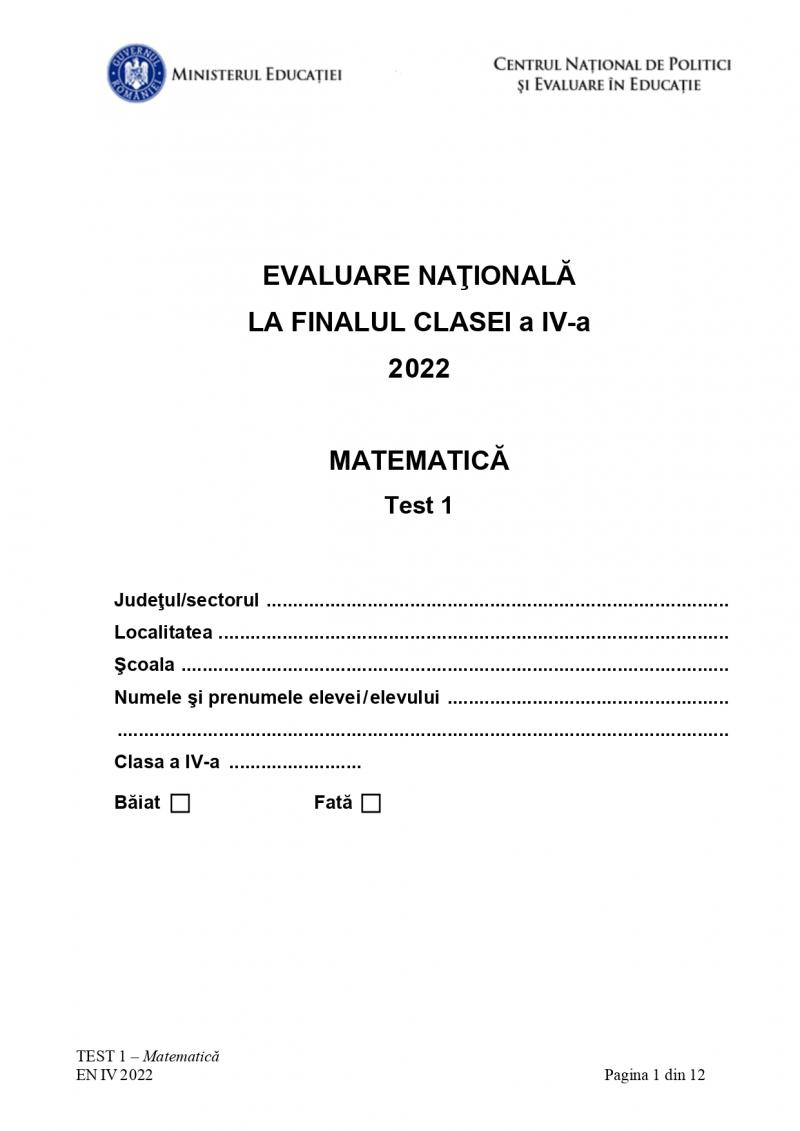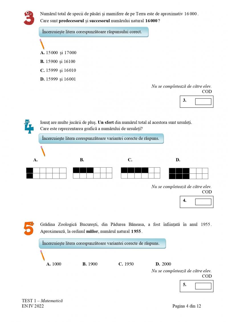 Testul 1 la Evaluarea Naţională 2022 - clasa a 4-a, matematică