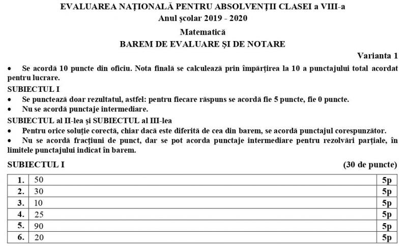 Evaluarea Naţională 2020. Barem de corectare la matematică
