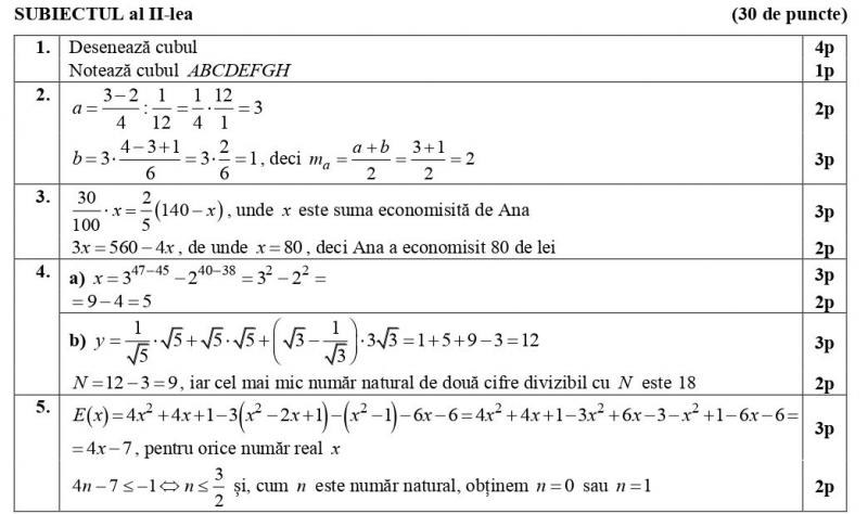 La matematică s-au dat trei subiecte, notate cu câte 30 de puncte fiecare, împărţite în câte 6 cerinţe a căror rezolvare corectă aduce 5 puncte elevilor.