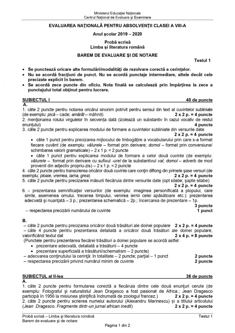 Evaluarea Naţională 2020. Barem de corectare limba şi literatura română