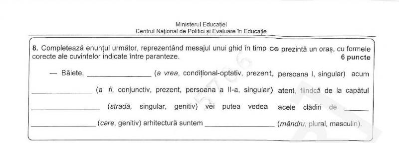 "Din păcate avem și itemi care au un procent mic de rezolvare. Spre exemplu, itemul 8 de la subiectul 1 B, doar 6% dintre elevi au rezolvat integral, corect acest exercițiu care vizează scrierea corectă. Cu alte cuvinte, doar 6% au putut să scrie perfect românește. Este o concluzie tristă, dar importantă.