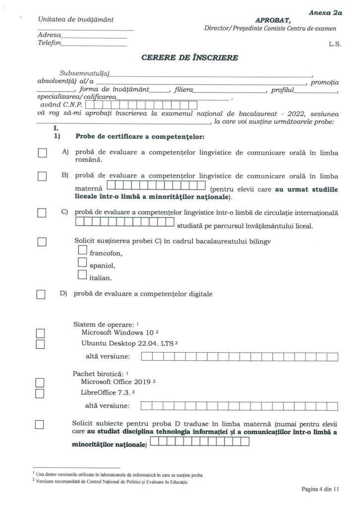 Toți candidații completează partea I a cererii de înscriere. Candidații care solicită recunoașterea / echivalarea unor probe susținute în anii anteriori/sesiunile anterioare completează partea I și partea a II-a din cererea de înscriere.