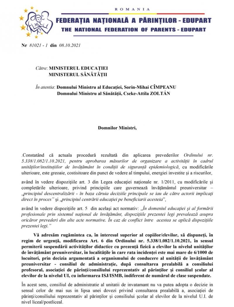 "Vă adresăm rugămintea ca, în interesul superior al copiilor/elevilor, să dispuneţi în regim de urgenţă modificarea Art. 6 din Ordinul nr. 5338/1082/1.10.2021, în sensul permiterii suspendării activităţilor didactice cu prezenţă fizică a elevilor la nivelul unităţilor de învăţământ preuniversitar, în localităţile în care rata incidenţei este mai mare de 6/1000 de locuitori", se arată în scrisoarea adresată celor două ministere.