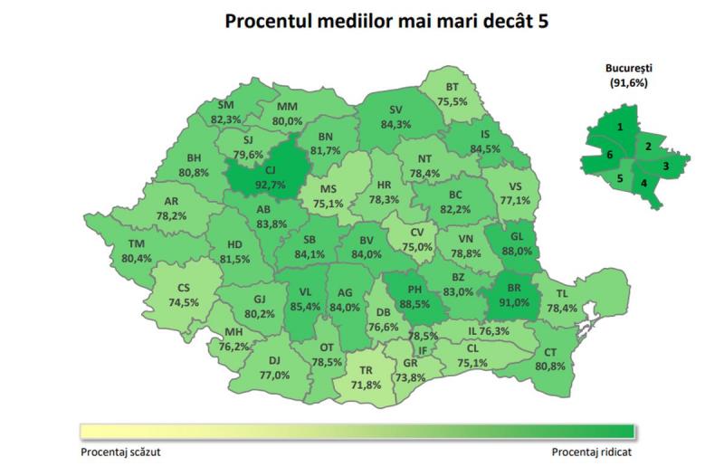 La matematică avem 77,5 la sută medii peste cinci, mai exact 115.126 de elevi. Cea mai mică ponderea notelor peste cinci a avut-o județul Teleorman, iar cea mai mare jud. Cluj cu 92,7 la sută. În București 91,6 la sută, Brăila 91 la sută. La limba română, procentul notelor peste 5 este de 85,9%, respectiv 127.920 de elevi, faţă de 84% anul trecut, un plus de aproape 2%", potrivit ministrului Educației.