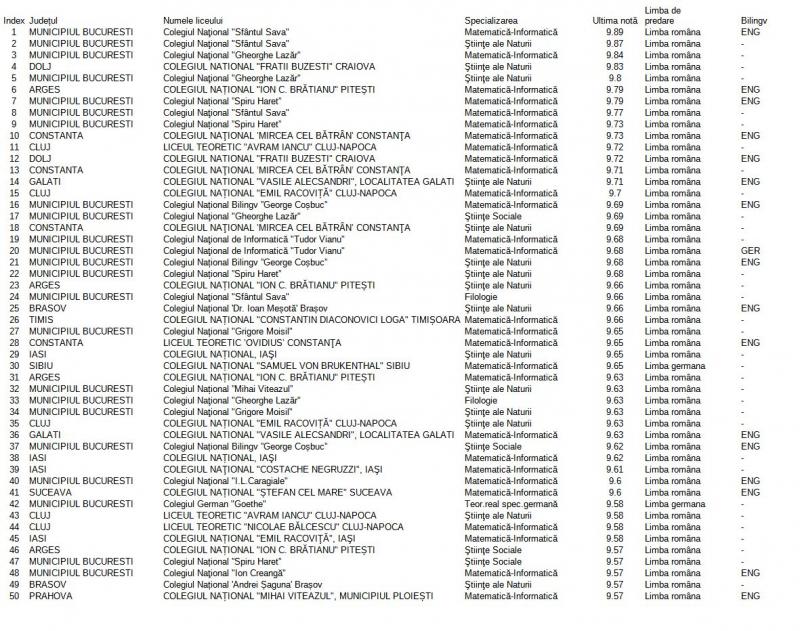 Dacă ne uităm la topul specializărilor, atunci vedem o listă care cuprinde Colegiul Sfântul Sava pe primul loc şi mai apoi Colegiul Gheorghe Lazăr, din Capitală, dar şi Colegiul Fraţii Buzeşti din Craiova şi Colegiul Ion Brătianu din Piteşti. Ultima medie de admitere pentru cel mai bun liceu este 9.89.