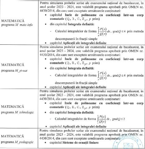 La Matematică, pentru simularea probelor scrise ale examenului național de bacalaureat, în anul școlar 2023-2024, este valabilă programa aprobată prin OMEN nr. 4430/2014, din care sunt exceptate conținuturi: