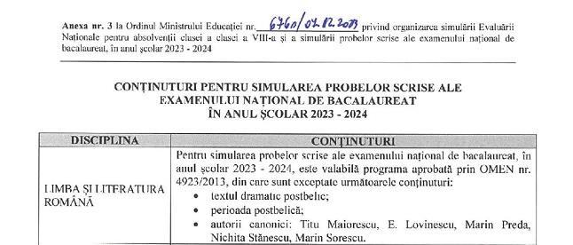 Programa pentru simularea examenului de BAC 2024 prevede eliminarea unor conținuturi la Limba română, Matematică, Istorie, Geografie, dar și la celelalte discipline, potrivit ordinului ministrului educației nr. 6.760 din 7 decembrie 2023.