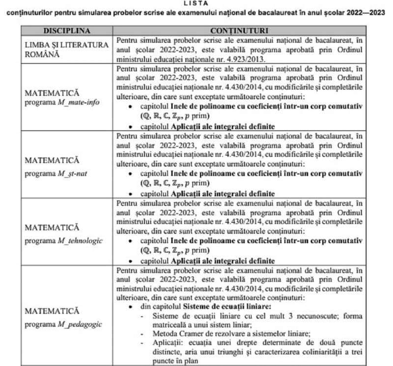 Pentru simularea probelor scrise ale examenului național de bacalaureat, în anul școlar 2022-2023, este valabilă programa aprobată prin Ordinul ministrului educației naționale nr. 4.923/2013. La limba română nu există niciun conținut exceptat. La probele scrise se pot utiliza tipizate tipărite aprobate pentru anii școlari precedenți. Comisia de organizare a simulării naționale din unitatea de învățământ asigură caspsarea în trei locuri (lateral stânga sus, jos și la mijloc) a lucrărilor scrise care depășesc un număr de patru pagini, așezate sub formă de caiet, în ordinea paginilor.