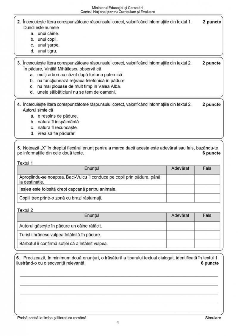La Subiectul I, elevii au avut de rezolvat mai multe tipuri de cerință printre care înțelegerea textului, inclusiv întrebări tip grilă și exerciții în care trebuiau să stabilească dacă anumite enunțuri sunt adevărate sau false. Alte cerințe au vizat identificarea unei trăsături a tiparului dialogat din primul text, prezentarea unui element comun celor două texte și explicarea emoțiilor copiilor atunci când sunt singuri în pădure.