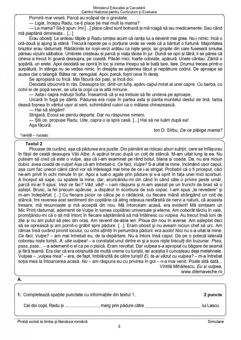 Elevii de clasa a VIII-a au primit două texte la prima vedere la simularea probei de limba și literatura română din cadrul Evaluării Naționale 2026. Primul text este un fragment din opera „De ce plânge mama?” de Ion D. Sîrbu, iar al doilea este articolul „Eu și vulpea”, semnat de Vintilă Mihăilescu.