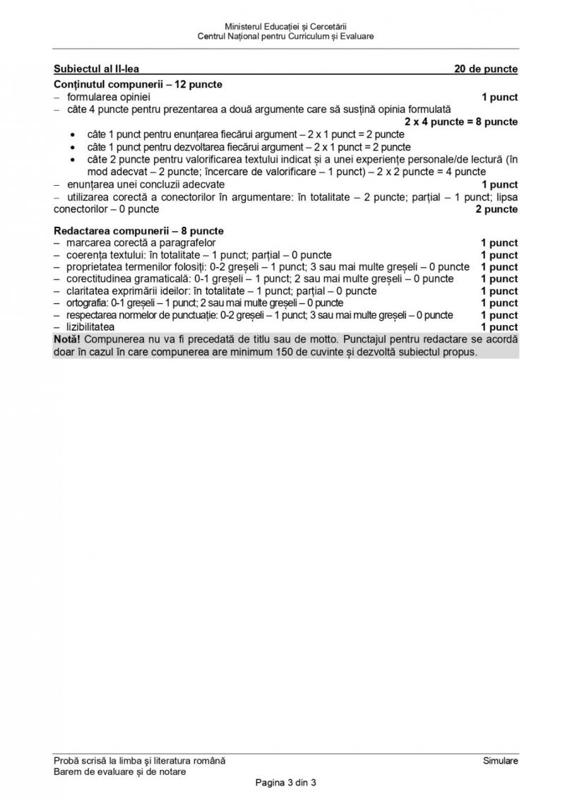 Punctajul maxim pentru probă este de 100 de puncte, dintre care 90 sunt acordate pentru rezolvarea subiectelor, iar 10 puncte sunt acordate din oficiu. Nota finală se obține prin împărțirea punctajului la 10. Subiectele exacte și baremele de corectare pentru simularea Evaluării Naționale se publică în fiecare zi, după încheierea probei, la ora 15:00, pe site-ul oficial al Ministerului Educației, pe platforma dedicată subiecte.edu.ro (secțiunea Subiecte și bareme).