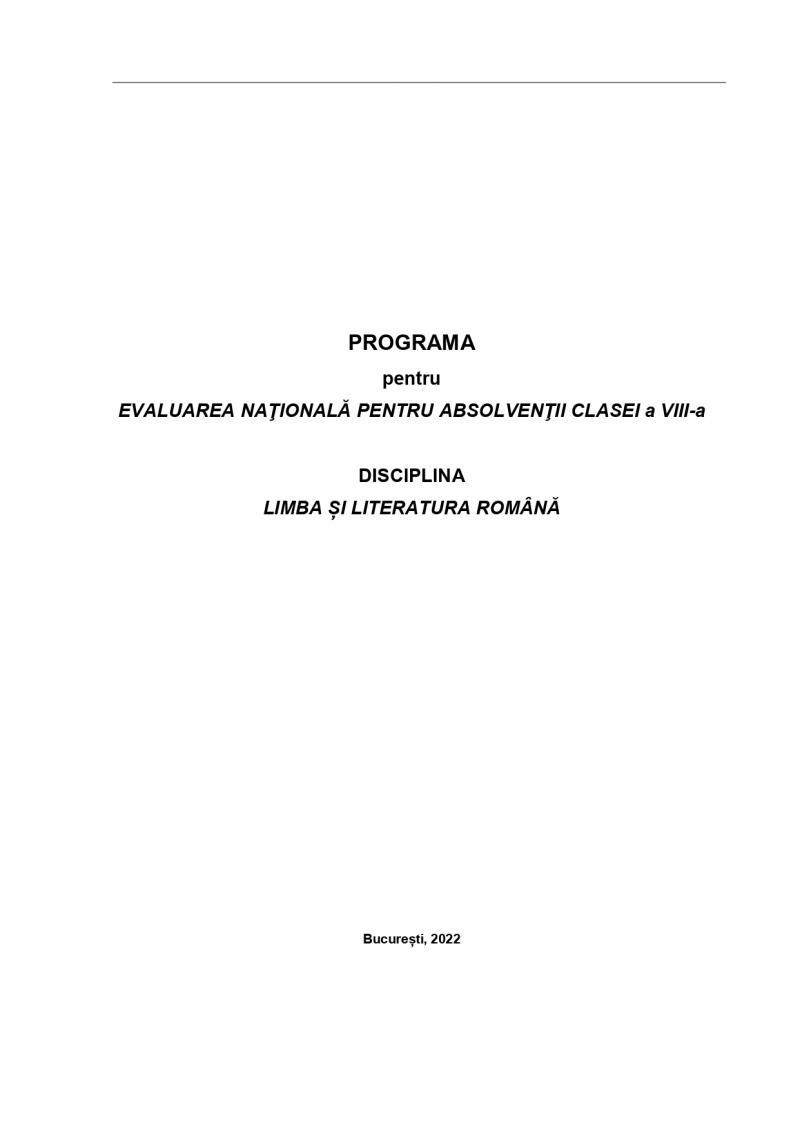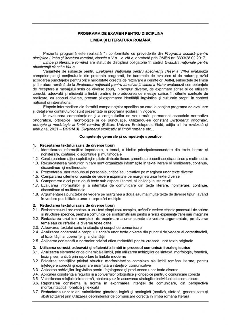 Subiectele de limba și literatura română evaluează competențele formate/dezvoltate pe parcursul învățământului gimnazial și se elaborează în baza Programei pentru evaluarea națională pentru absolvenții clasei a VIII-a, aprobată prin Ordinul ministrului educatiei nr. 3393/28.02.2017. Astfel, subiectele de limba și literatura română de la Evaluarea naţională 2025 evaluează competențele de receptare a mesajului scris de diverse tipuri, în scopuri diverse, de exprimare scrisă și de utilizare corectă, adecvată și eficientă a limbii române în producerea de mesaje scrise, în diferite contexte de realizare, cu scopuri diverse, precum și exprimarea identității lingvistice și culturale proprii în context național și internațional. Etapele intermediare ale formării competențelor specifice pe care le conține programa de evaluare și detalierea conținuturilor sunt prezentate în programa școlară în vigoare. În evaluarea competențelor și a conţinuturilor se vor urmări permanent aspectele normative ortografice, ortoepice, morfologice şi de punctuaţie, utilizându-se constant Dicționarul ortografic, ortoepic şi morfologic al limbii române (Editura Univers Enciclopedic Gold, ediția a III-a revăzută și adăugită, 2021 – DOOM 3), Dicţionarul explicativ al limbii române etc.