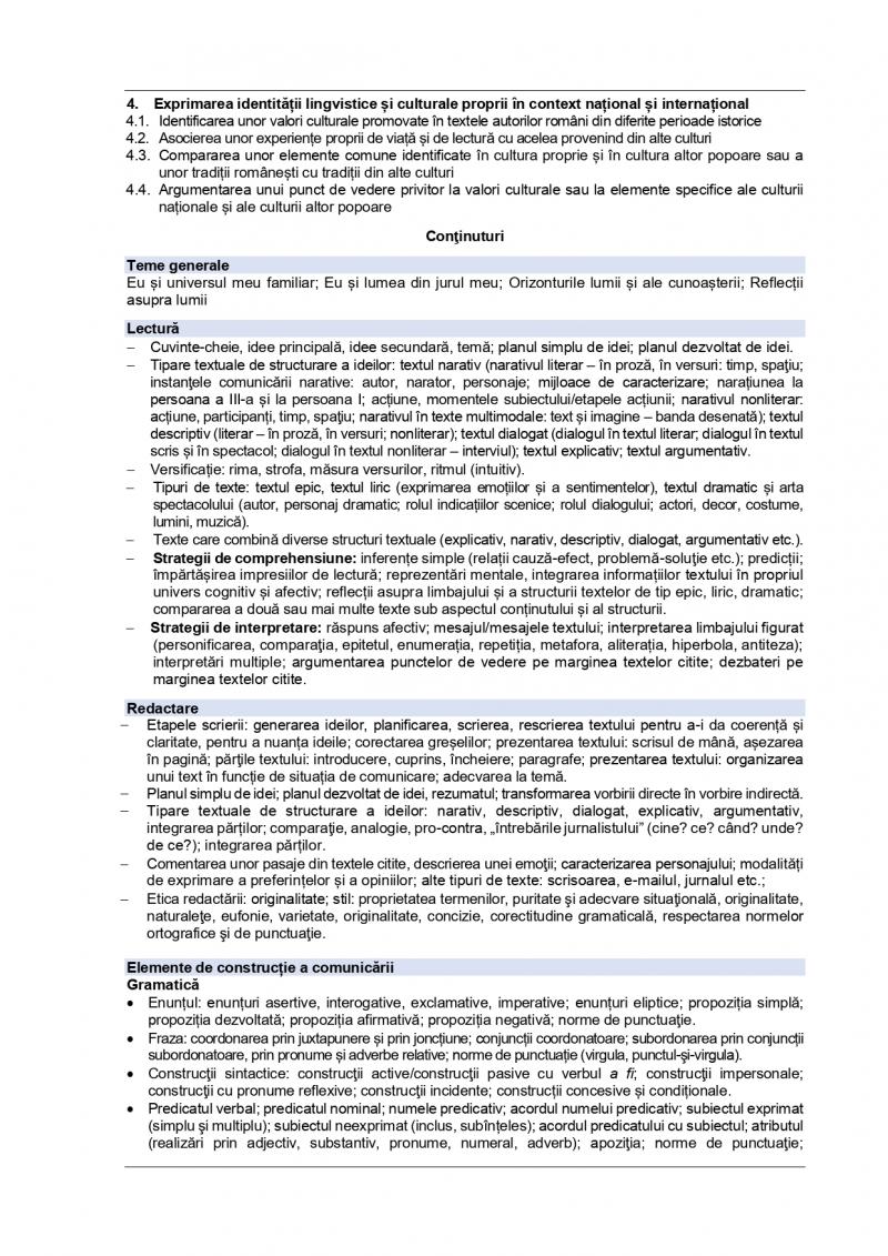 • Strategii de comprehensiune: inferențe simple (relații cauză-efect, problemă-soluţie etc.); predicții; împărtășirea impresiilor de lectură; reprezentări mentale, integrarea informațiilor textului în propriul univers cognitiv și afectiv; reflecții asupra limbajului și a structurii textelor de tip epic, liric, dramatic; compararea a două sau mai multe texte sub aspectul conținutului și al structurii.
