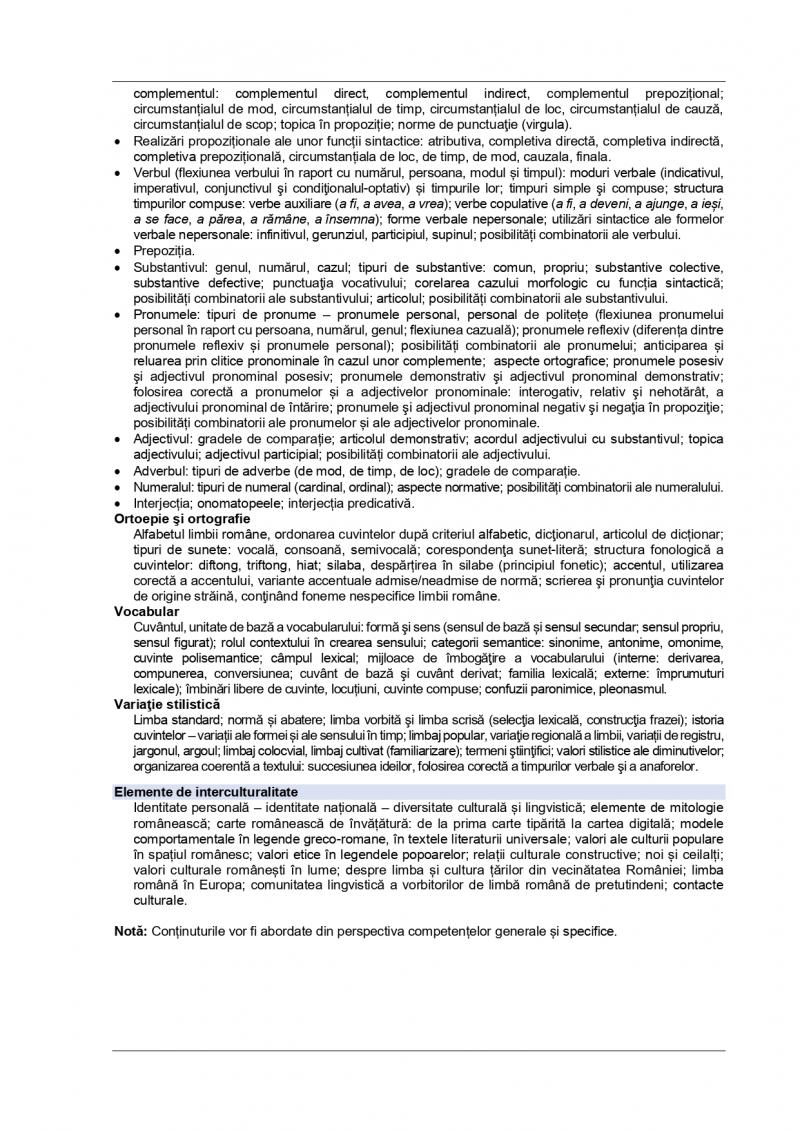 • Verbul (flexiunea verbului în raport cu numărul, persoana, modul și timpul): moduri verbale (indicativul, imperativul, conjunctivul şi condiţionalul-optativ) și timpurile lor; timpuri simple şi compuse; structura timpurilor compuse: verbe auxiliare (a fi, a avea, a vrea); verbe copulative (a fi, a deveni, a ajunge, a ieși, a se face, a părea, a rămâne, a însemna); forme verbale nepersonale; utilizări sintactice ale formelor verbale nepersonale: infinitivul, gerunziul, participiul, supinul; posibilități combinatorii ale verbului.