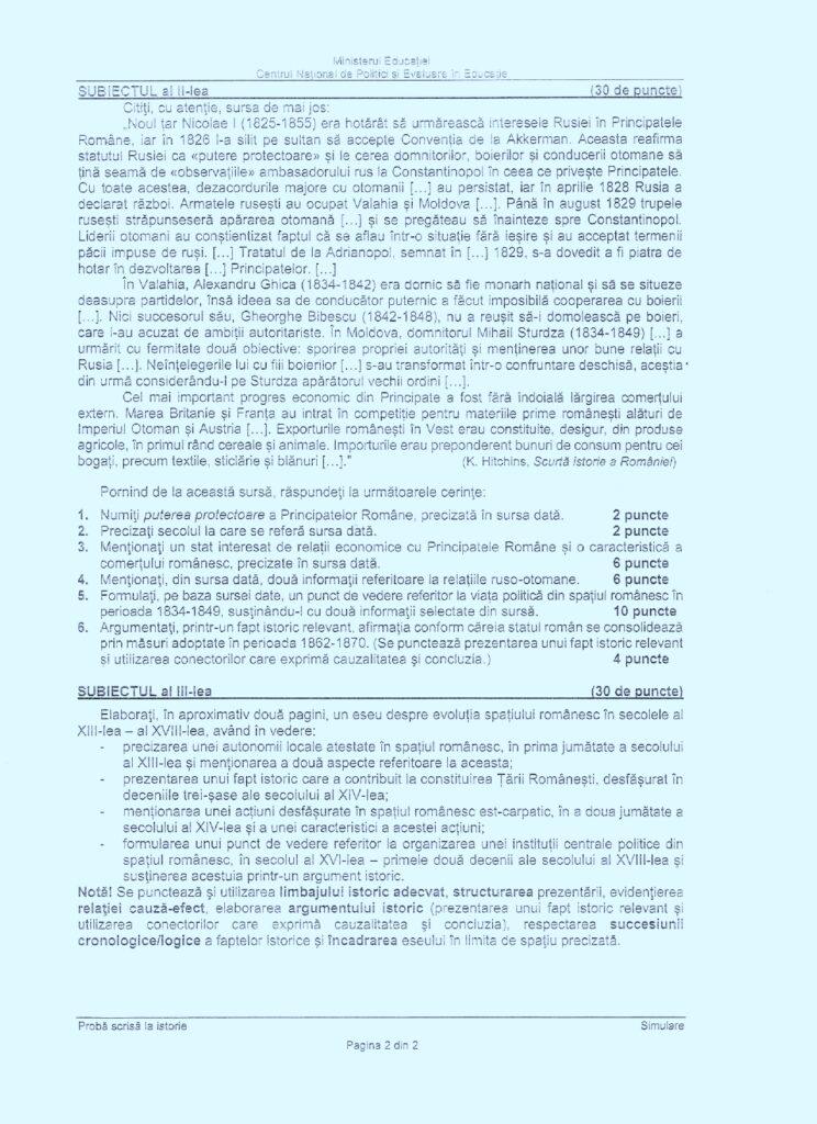 UPDATE 12:20 Elevii de clasa a XII-a au avut de scris, la subiectul III, un eseu despre evoluția spațiului românesc în secolele al XIII-lea – al XVIII-lea, potrivit subiectelor publicate de Edupedu.ro. La subiectul I, liceenii au avut de rezolvat mai multe cerințe pe baza a două texte suport de K. Hitchins, Scurta istorie a României, și un fragment din Cartea neagră a comunismului.