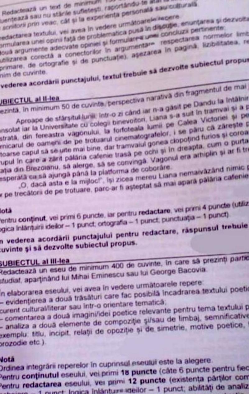 UPDATE 11:00 La subiectul III, absolvenţii de clasa a XII-a au avut de scris un eseu de cel puțin 400 de cuvinte în care să prezinte particularitățile unui text poetic aparținând lui Mihai Eminescu sau George Bacovia.