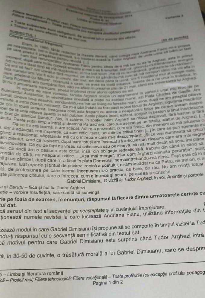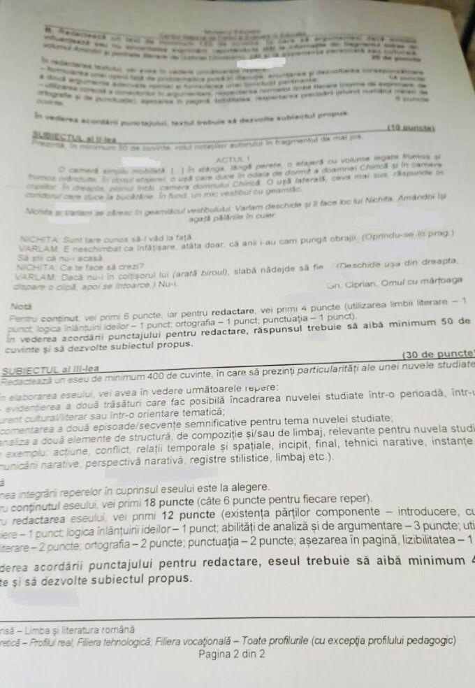 La subiectul al III-lea, proba scrisă la română, sesiunea de vară, elevii au avut de scris un eseu de minimum 400 de cuvinte despre particularitățile unei nuvele studiate. La Subiectul I, candidaţii au primit un text de Gabriel Dimisianu, pe baza căruia au avut de rezolvat mai multe cerințe. Apoi, la cel de-al doilea subiect, elevii au avut de prezentat rolul notațiilor autorului într-un text dat.