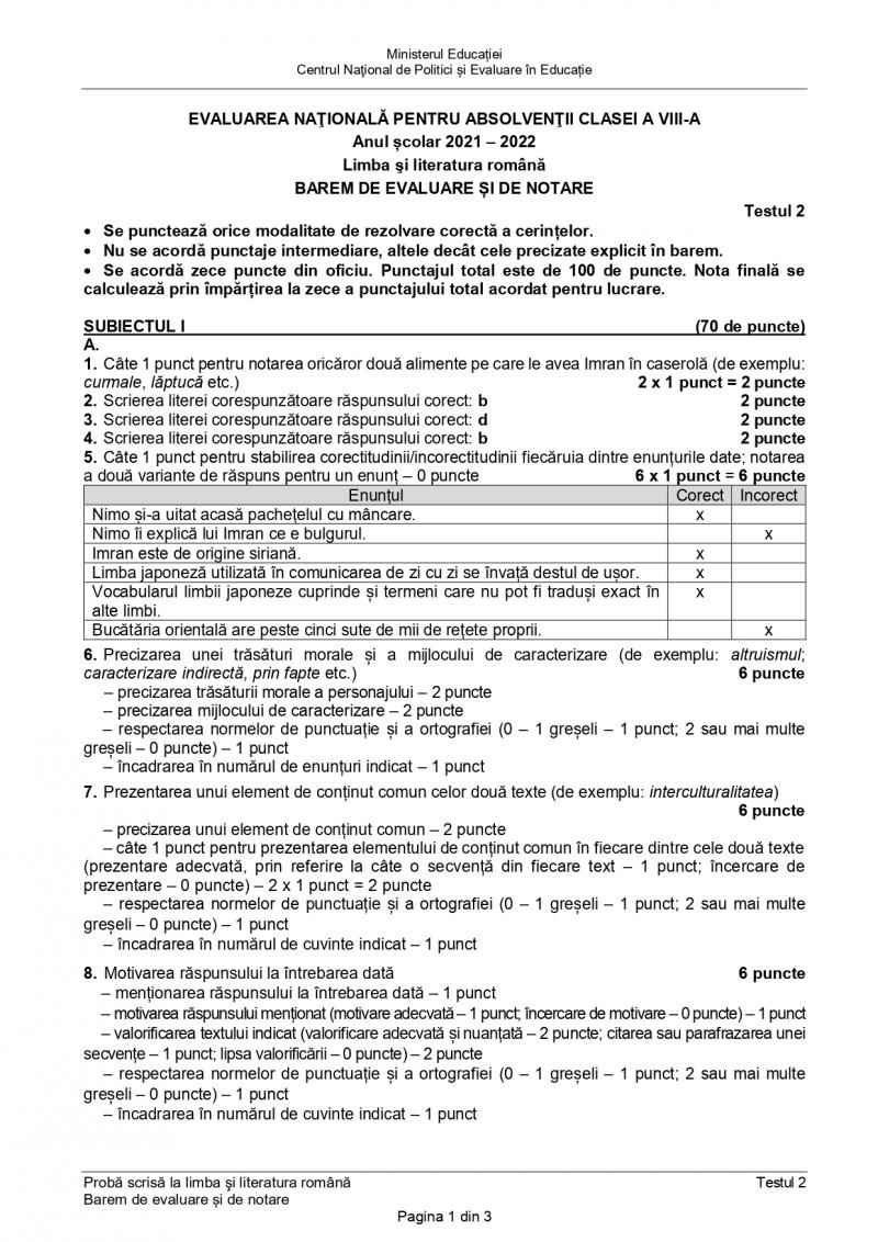 Testul 2 de antrenament pentru Evaluare Naţională 2022 - barem de corectare la limba şi literatura română