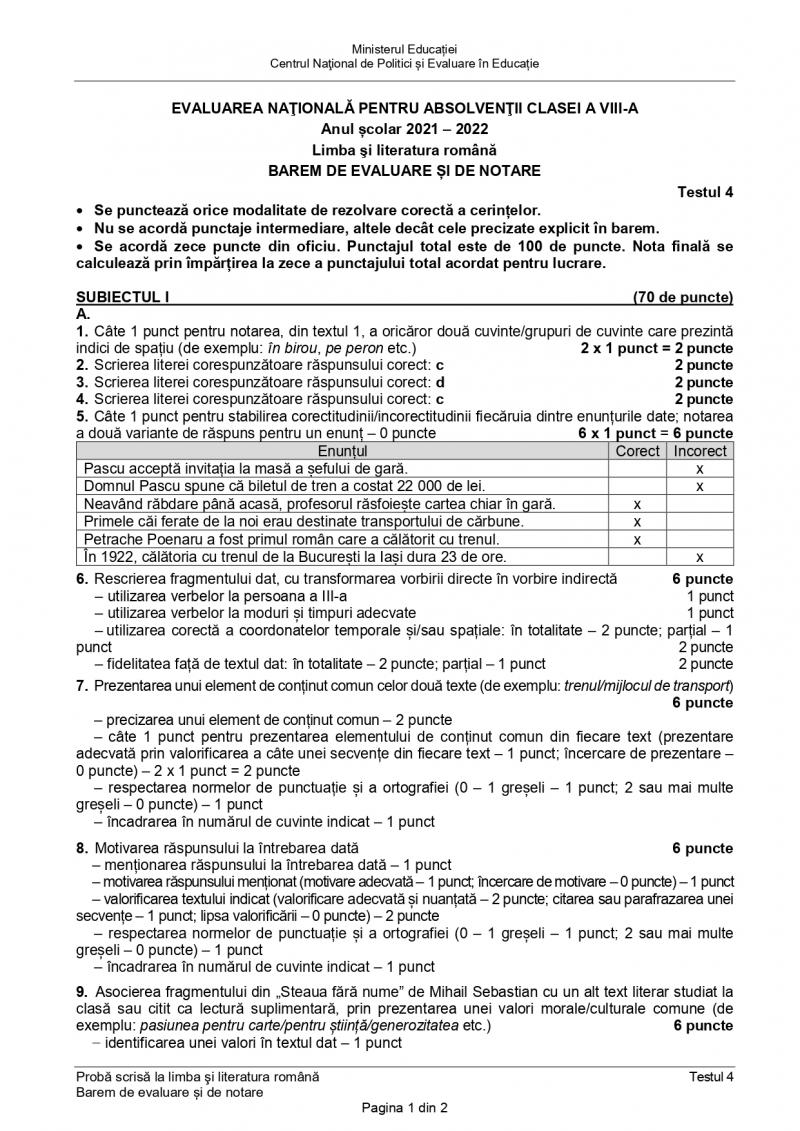 Testul 4 de antrenament pentru Evaluare Naţională 2022 - barem de corectare la limba română