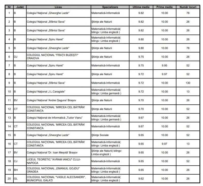 Ministerul Educației a publicat lista cu primele 20 licee la nivel național după ultima medie de admitere. Astfel, Colegiul Național "Gheorghe Lazăr", care anul trecut era pe locul 2, se află pe prima poziție. Colegiul Naţional de Informatică "Tudor Vianu" din București a coborât de pe primul loc, pe locul secuns, iar pe locul trei este Colegiul Național "Sfântul Sava", care se menține pe aceeași poziție ca în 2024. Media ultimului admis la cele două colegii aflate pe primele poziții este 9.62.