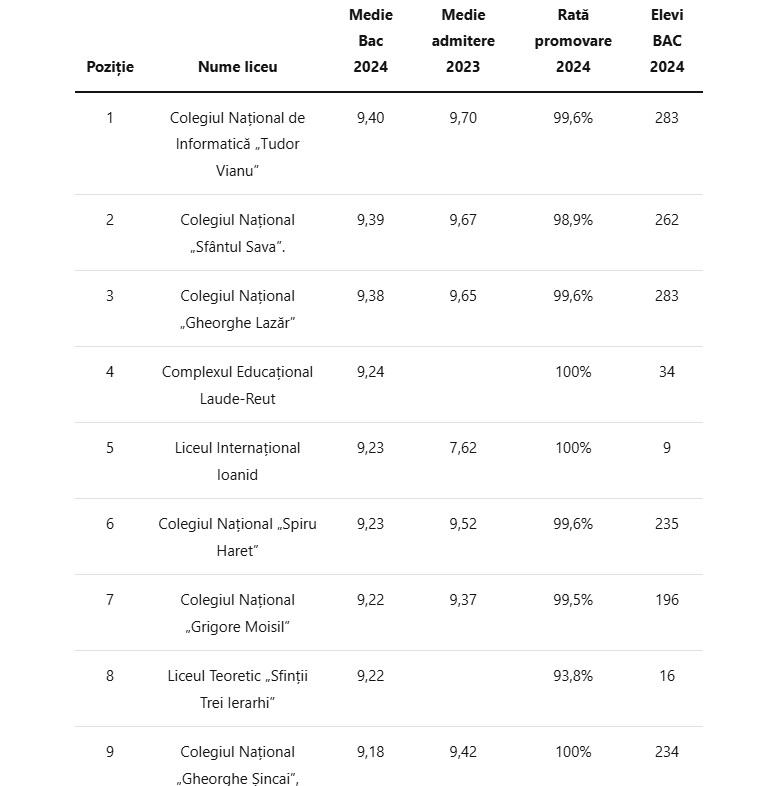 Şi în 2025, specialiştii se aşteaptă să fie o bătălie mare pe un loc la un liceu de top din Bucureşti. În 2024, Colegiul Național de Informatică “Tudor Vianu” din București s-a aflat pe primul loc în clasamentul mediilor de la Bac. Colegiul Național “Sf. Sava” a ocupat locul 2, în timp ce Colegiul Național “Gheorghe Lazăr” a fost pe locul 3, după media de la BAC.