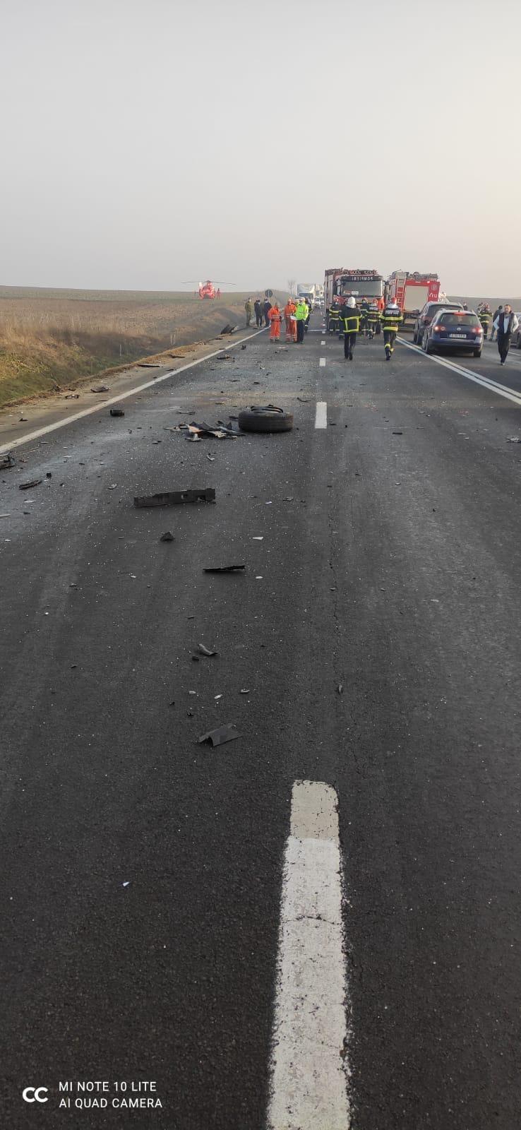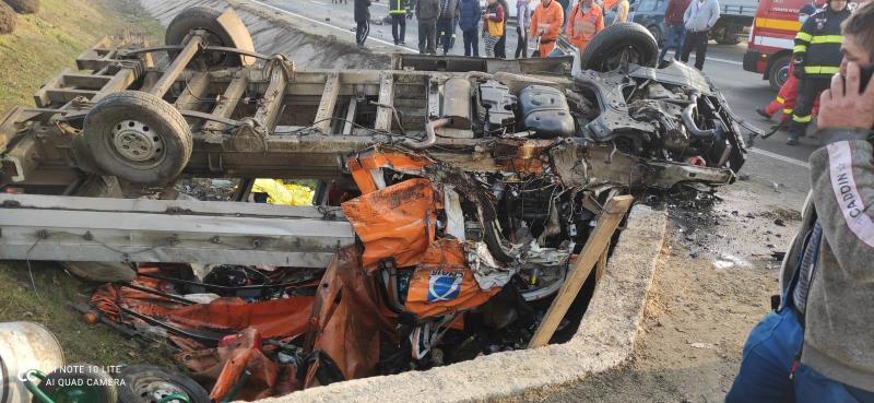 Actualizare 9:45 - Bilanțul accidentului a crescut la doi morți: un bărbat de 55 de ani, din Ilfov, care se afla în autoutilitara CNAIR, şi o femeie de 40 de ani, pasageră în autoturism.