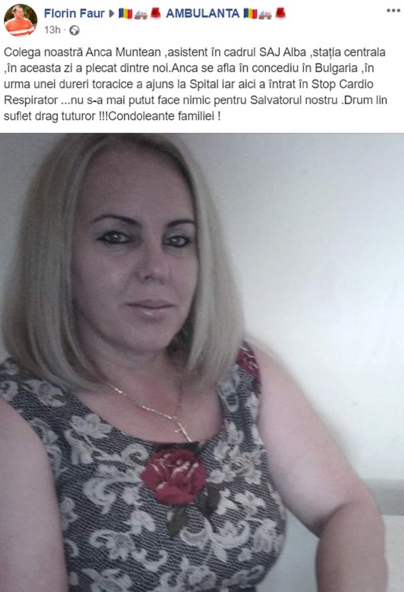 "Colega noastră Anca Muntean, asistent în cadrul SAJ Alba, staţia centrala, în aceasta zi, a plecat dintre noi. Anca se afla în concediu în Bulgaria, în urma unei dureri toracice a ajuns la Spital iar aici a întrat în Stop Cardio Respirator ... nu s-a mai putut face nimic pentru Salvatorul nostru. Drum lin suflet drag tuturor!!! Condoleante familiei!", a scris un coleg al Ancăi Muntean, pe un grup al salvatorilor de la Ambulanţa Alba.